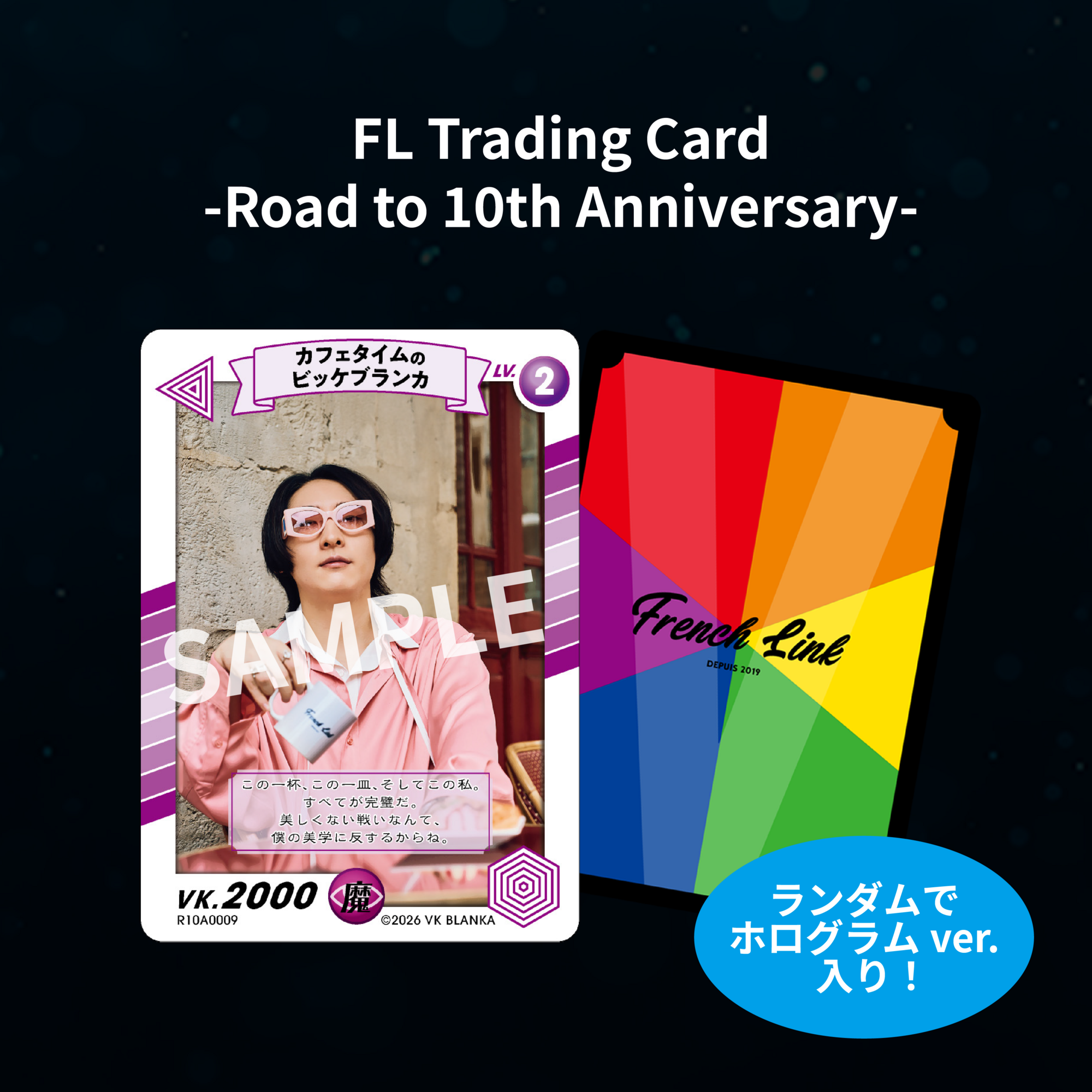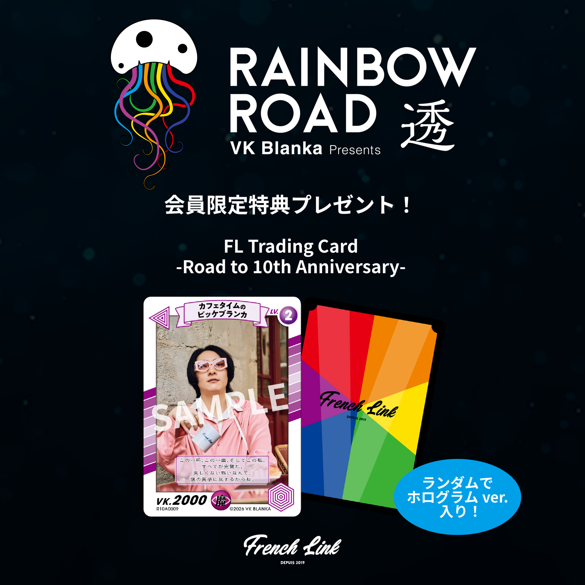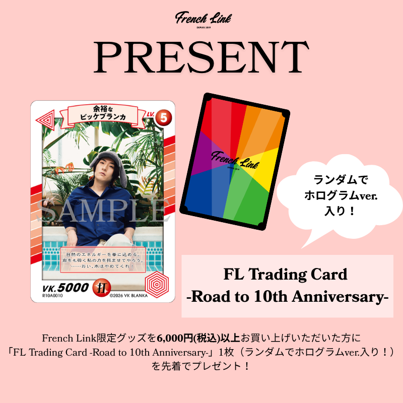 リニューアル時の撮り下ろし写真を使用したトレカ『VK Blanka presents RAINBOW ROAD -透-』限定のトレカ"FL Trading Card -Road to 10th Anniversary-"(ランダムでホログラムver.入り!)を1枚プレゼント!